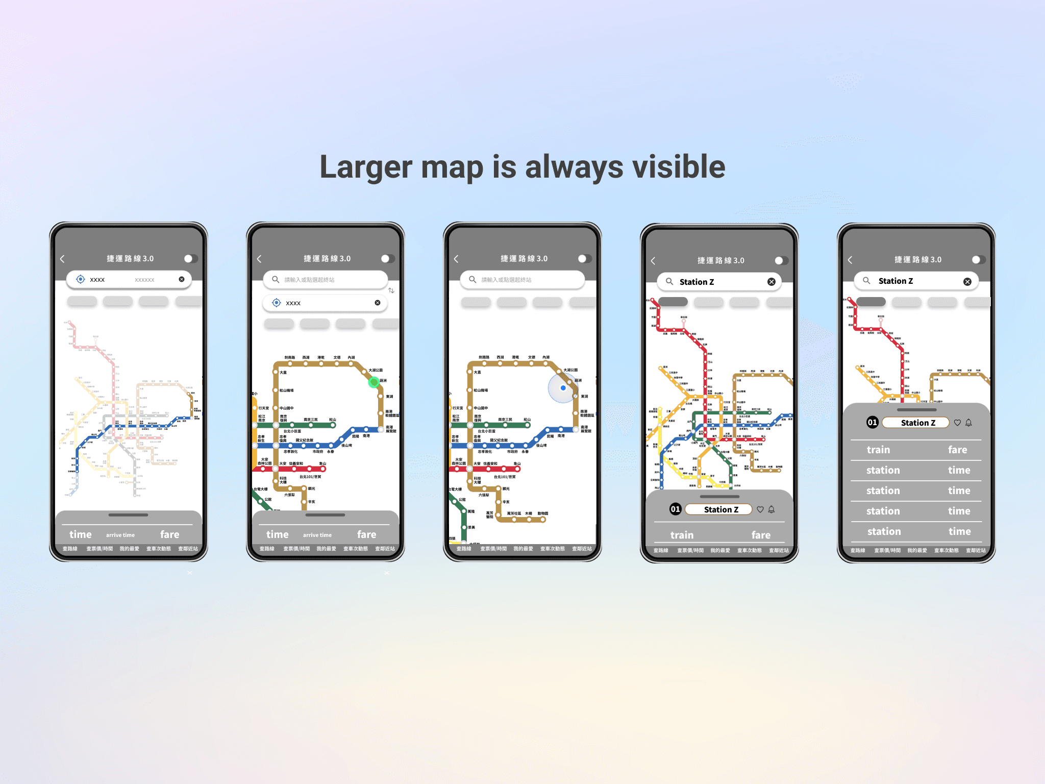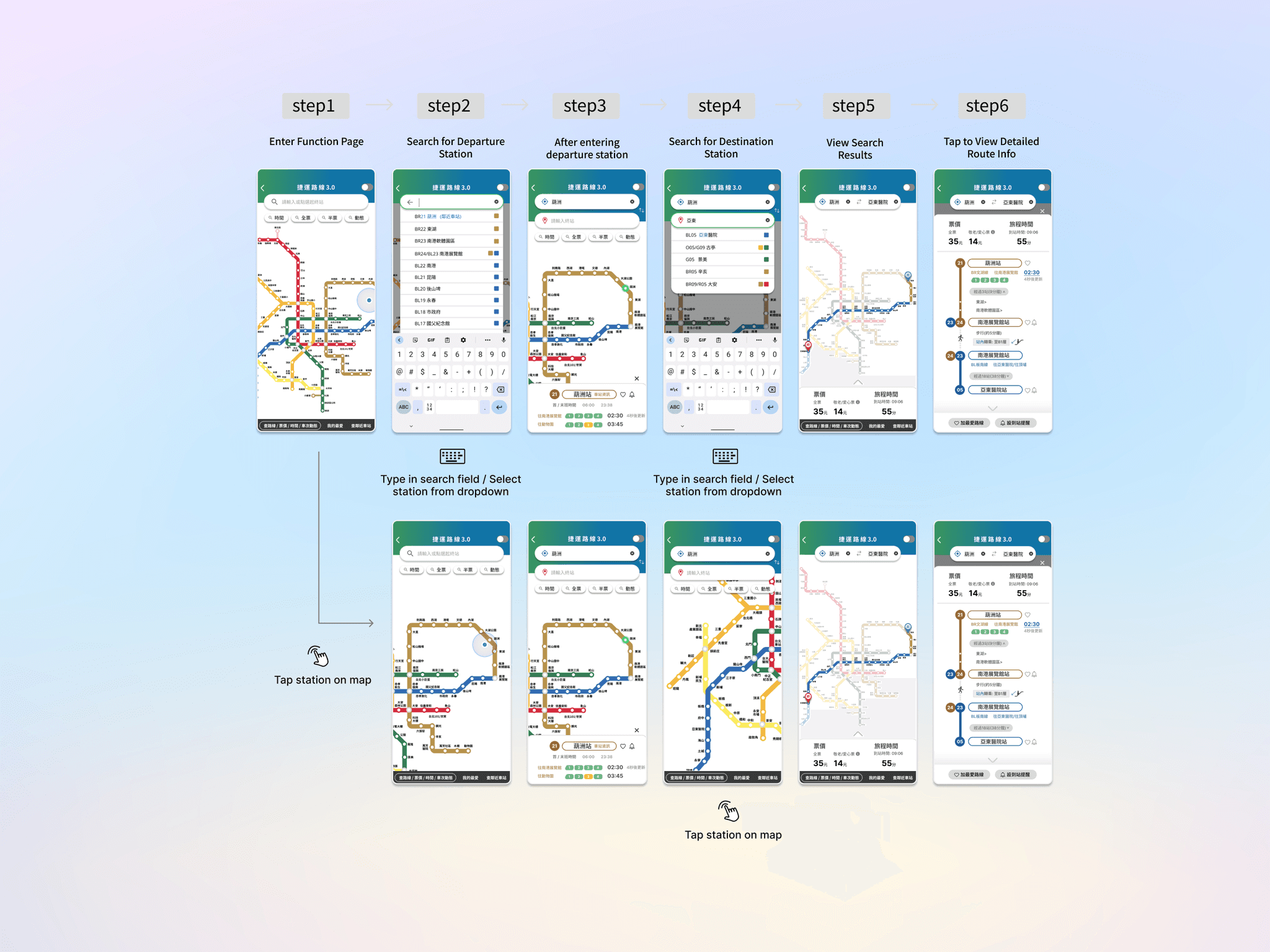 In the final design, I supported both. Users can tap directly on the map or type into the search bar, and a dropdown list to select stations. Once they have finished choosing a start and end point, the system immediately displays the route, estimated time, and transfer details in the bottom sheet, all without leaving the main map view. This flexibility enabled people with diverse habits to feel at ease using the app. Additionally, users can filter by time and ticket fee via the button below the search bar, and zoom in to see the estimated time or price inside the station dot.