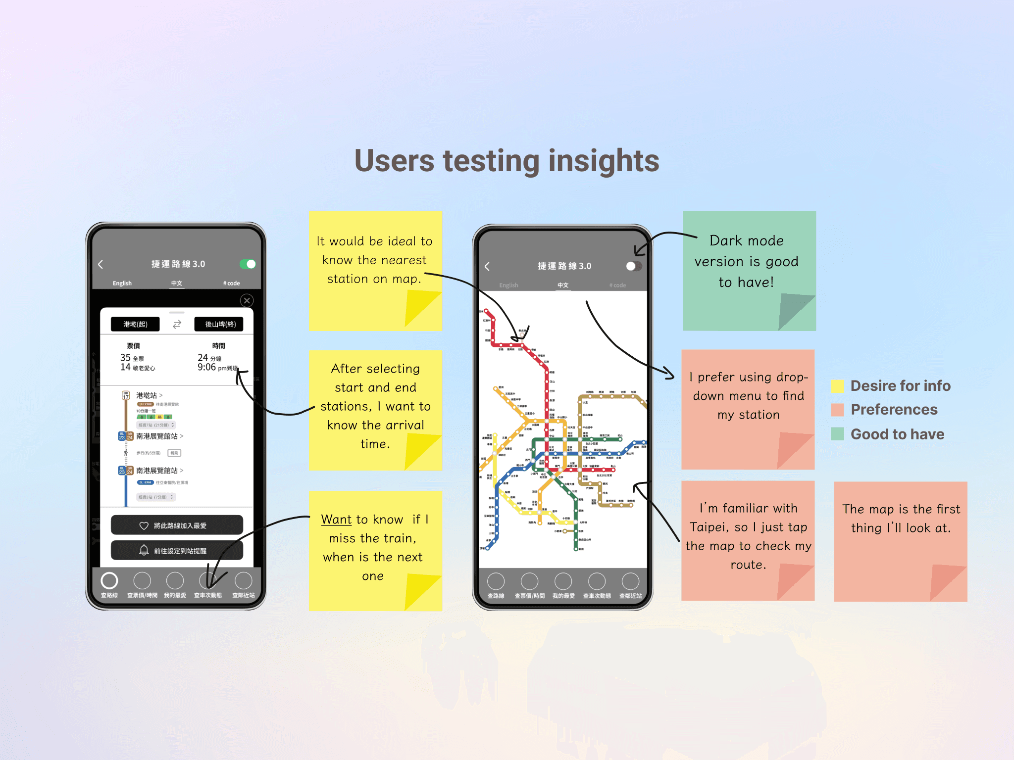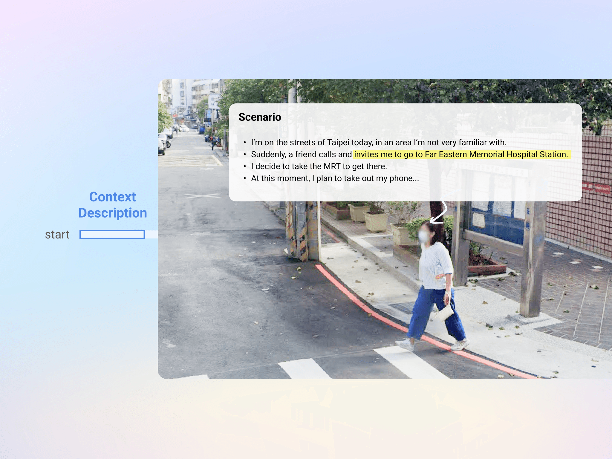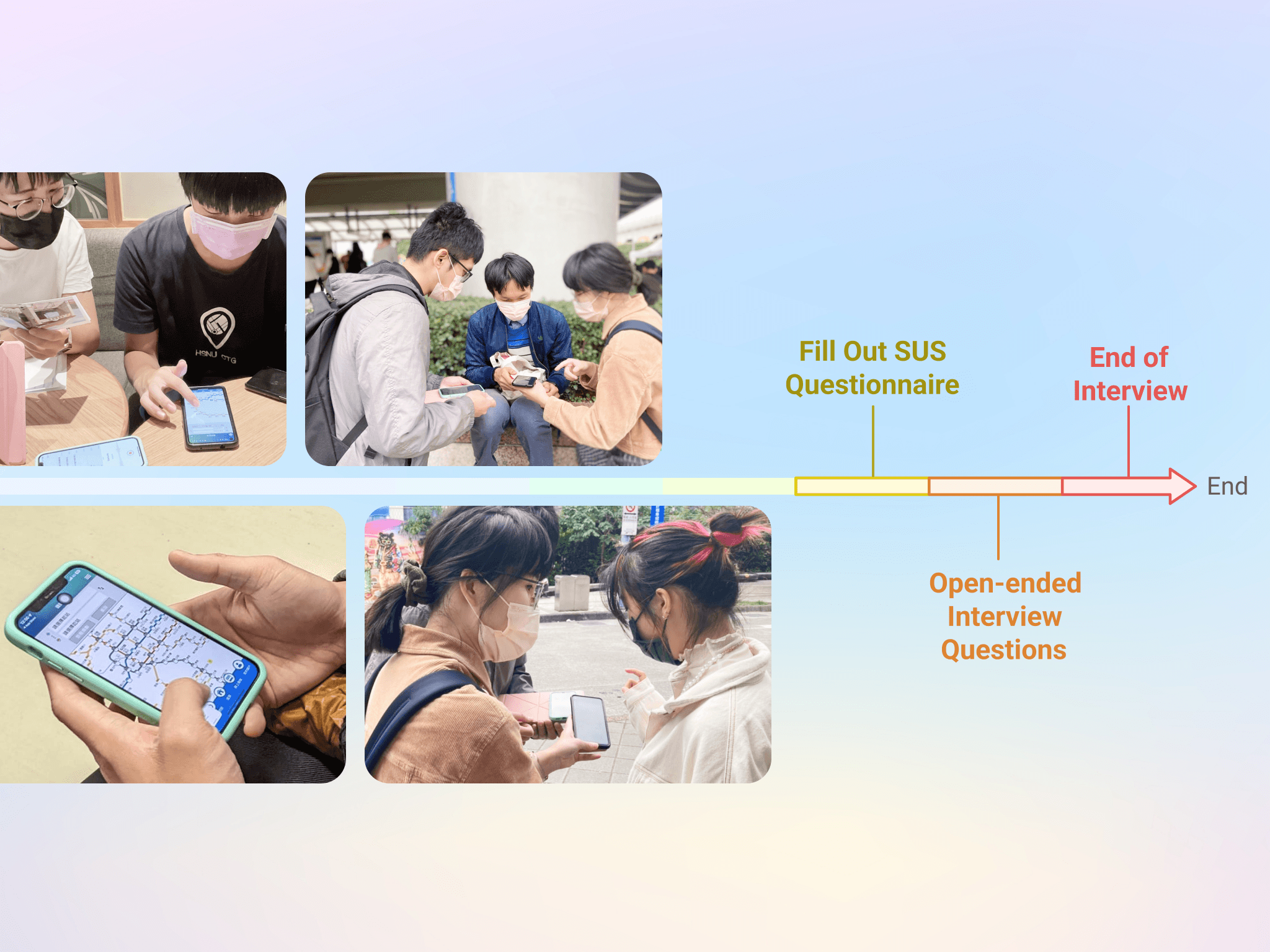 I designed a task for low-fidelity prototype testing. “You’re in an unfamiliar part of Taipei. A friend suddenly asks you to meet at Far Eastern Hospital Station. You grab your phone…” Why this scenario? Because it’s real: spontaneous, location-based, and time-pressured. Each participant first tried the existing app, then our redesigned prototype. Each session lasted ~40 minutes.
