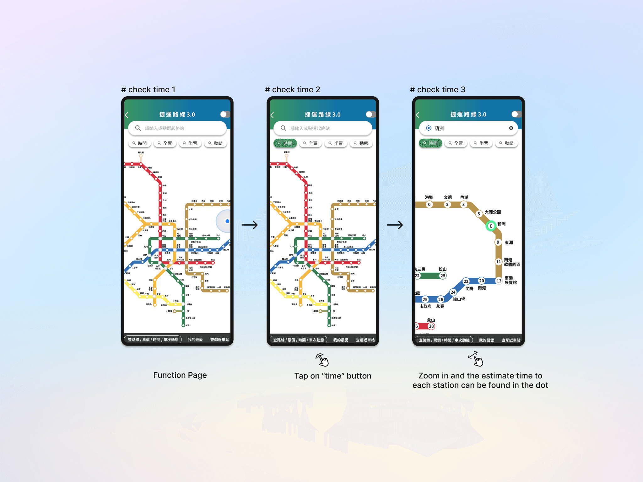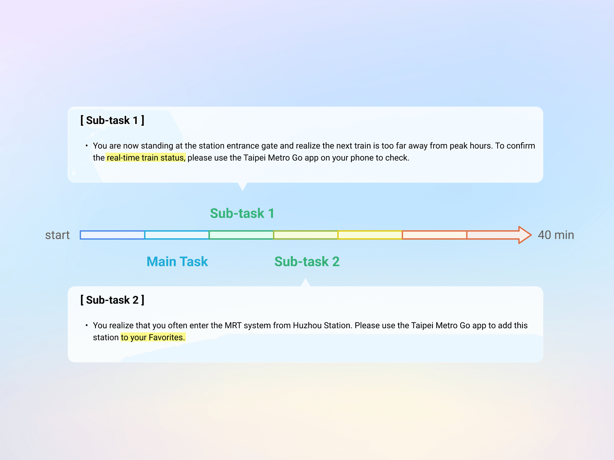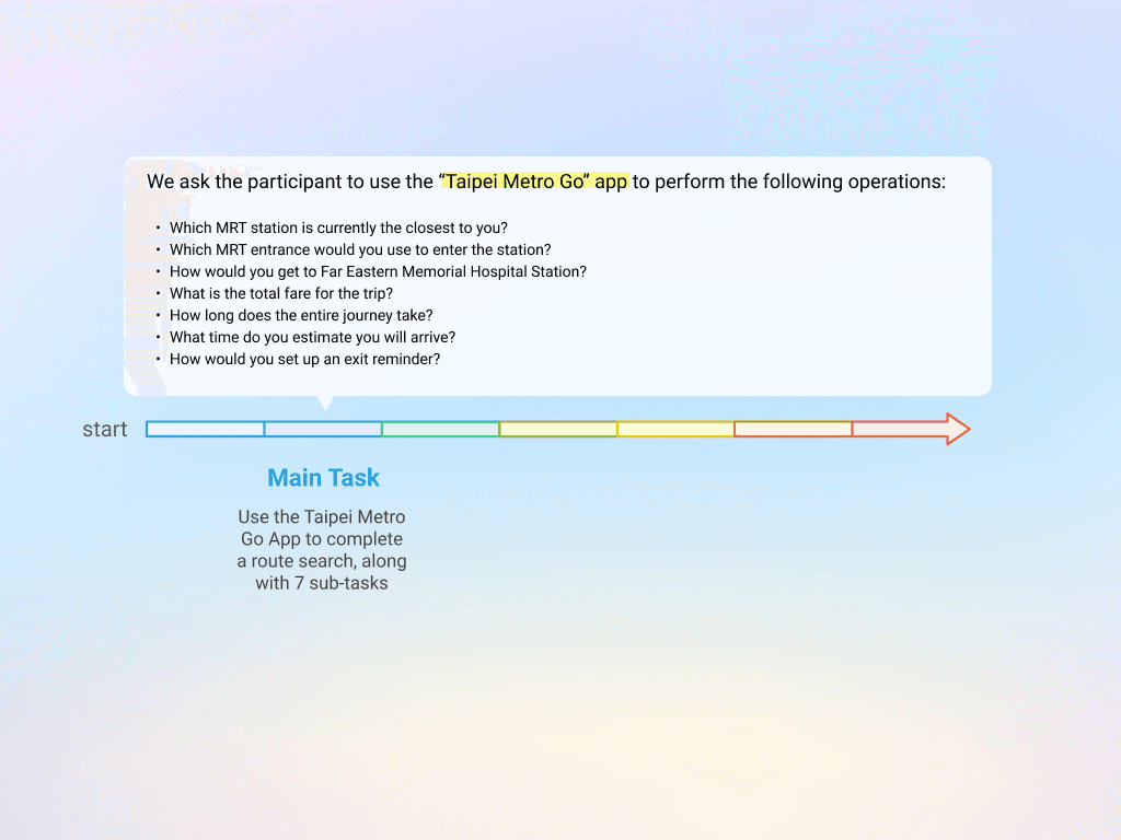 I designed a task for low-fidelity prototype testing. “You’re in an unfamiliar part of Taipei. A friend suddenly asks you to meet at Far Eastern Hospital Station. You grab your phone…” Why this scenario? Because it’s real: spontaneous, location-based, and time-pressured. Each participant first tried the existing app, then our redesigned prototype. Each session lasted ~40 minutes.