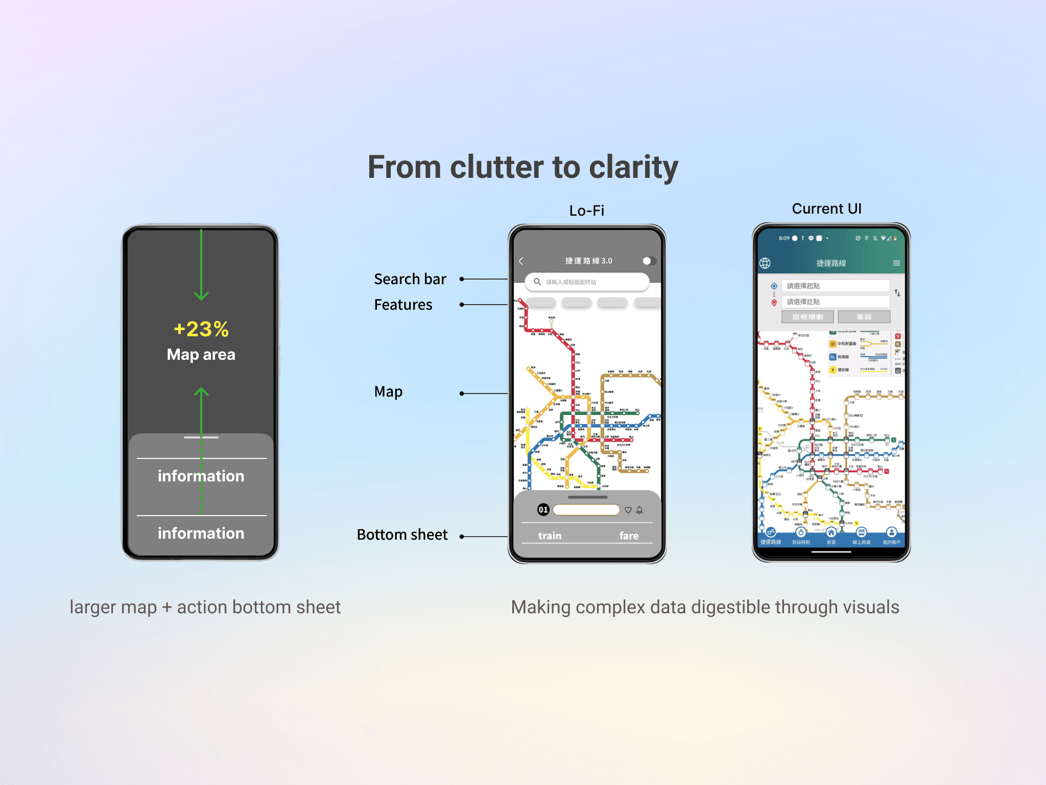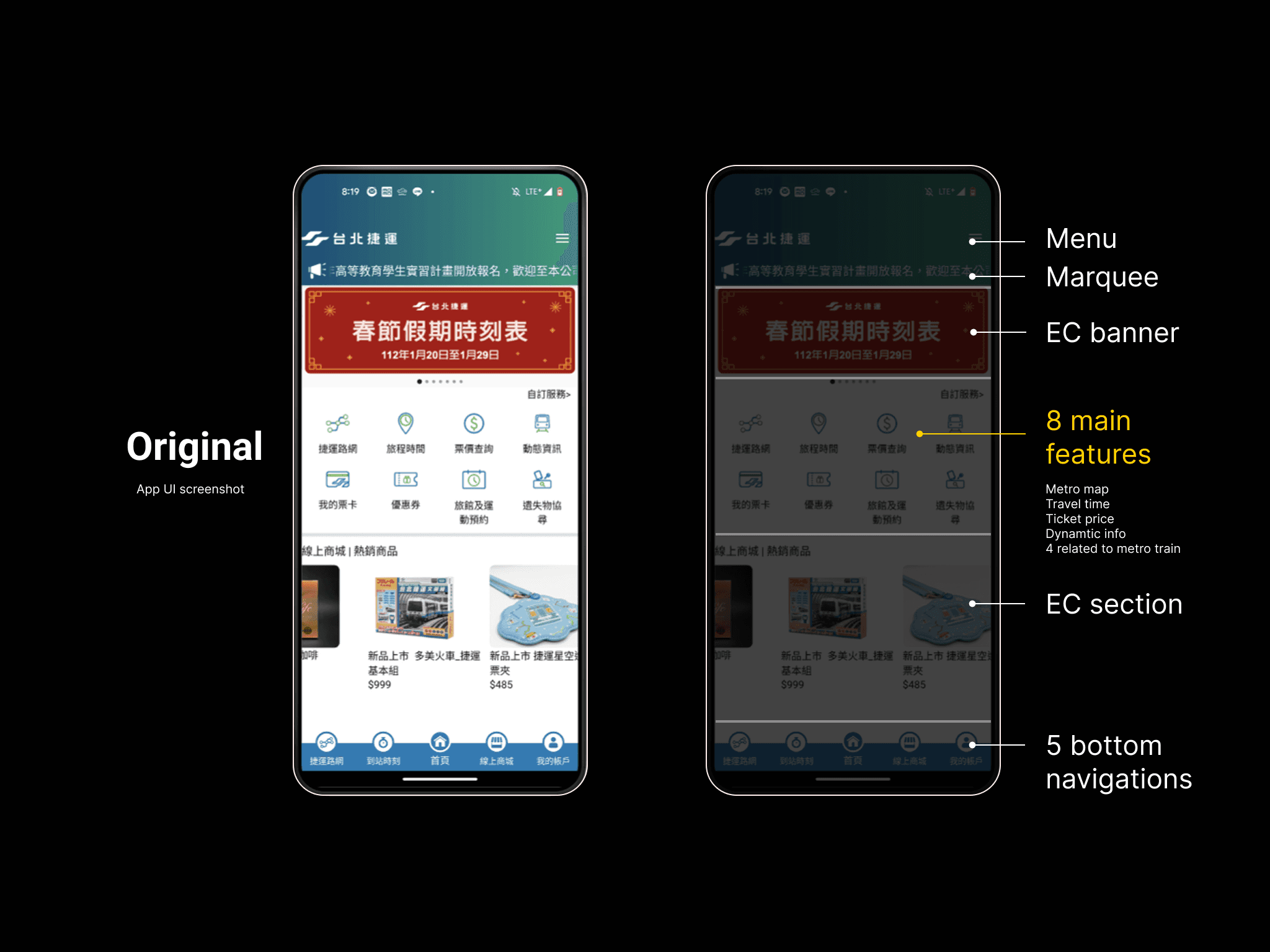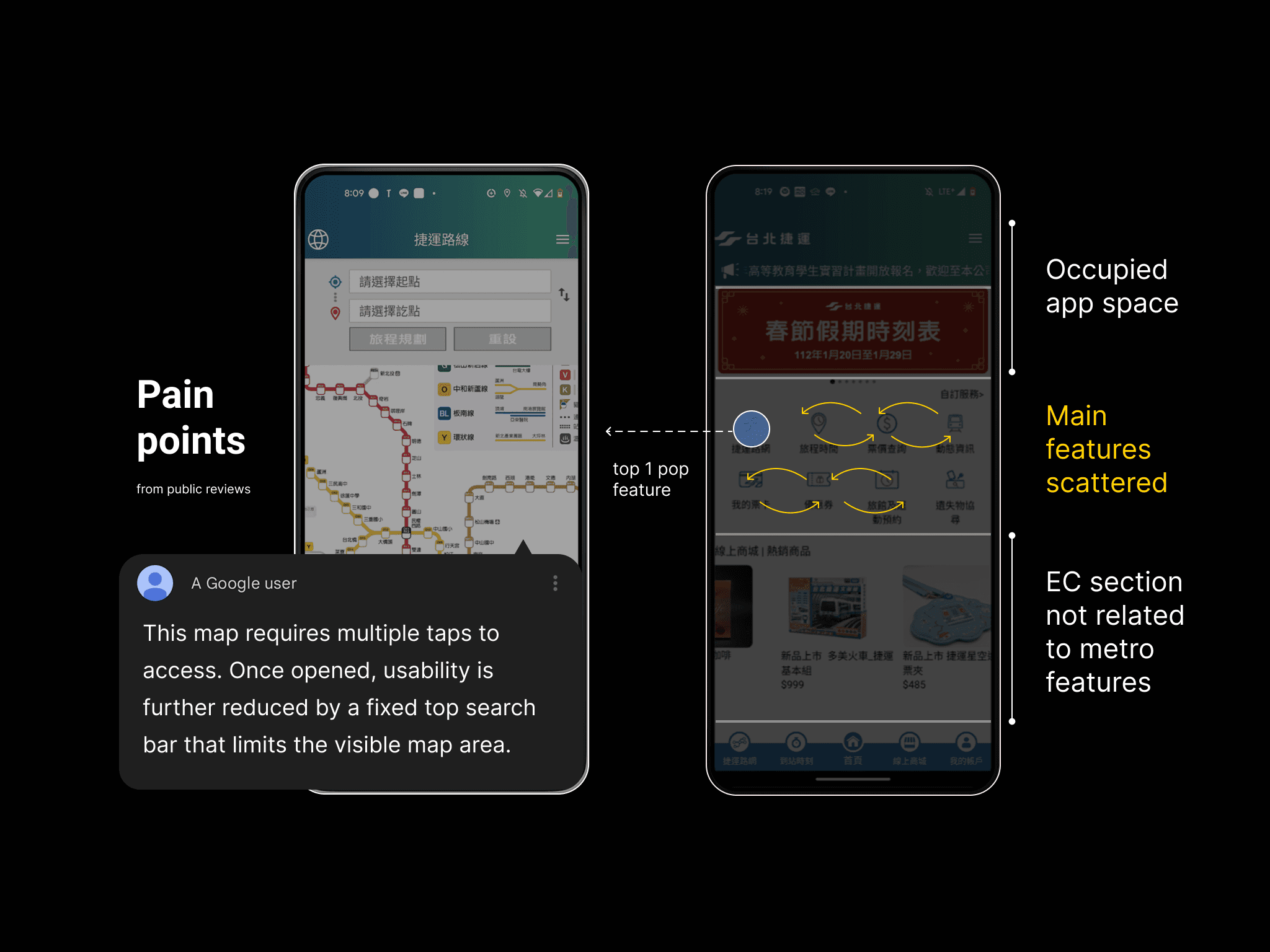 02 Uncovering User Pain Points The existing Taipei Metro app had a cluttered structure, redundant navigation paths, and no clear entry point to the map—a feature users accessed most frequently. We also discovered inconsistent UI patterns and confusing language that increased user anxiety during commutes. Through heuristic evaluation and user feedback, we identified that the app needed not just a visual redesign, but a fundamental rethinking of its information hierarchy.