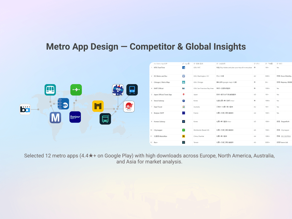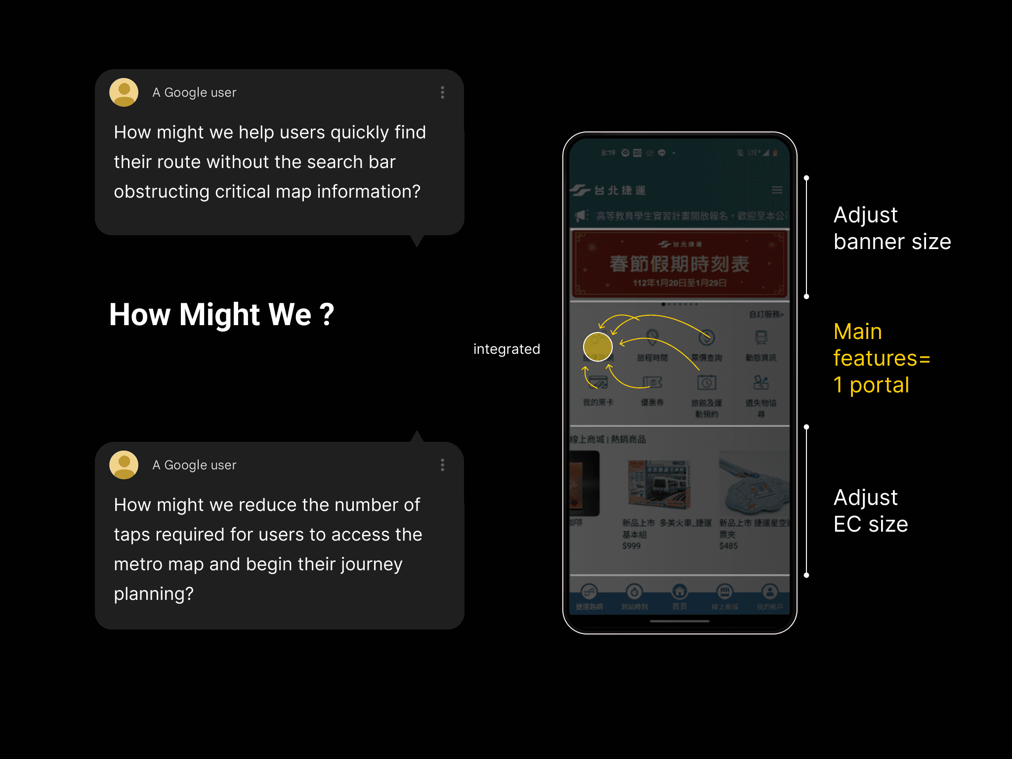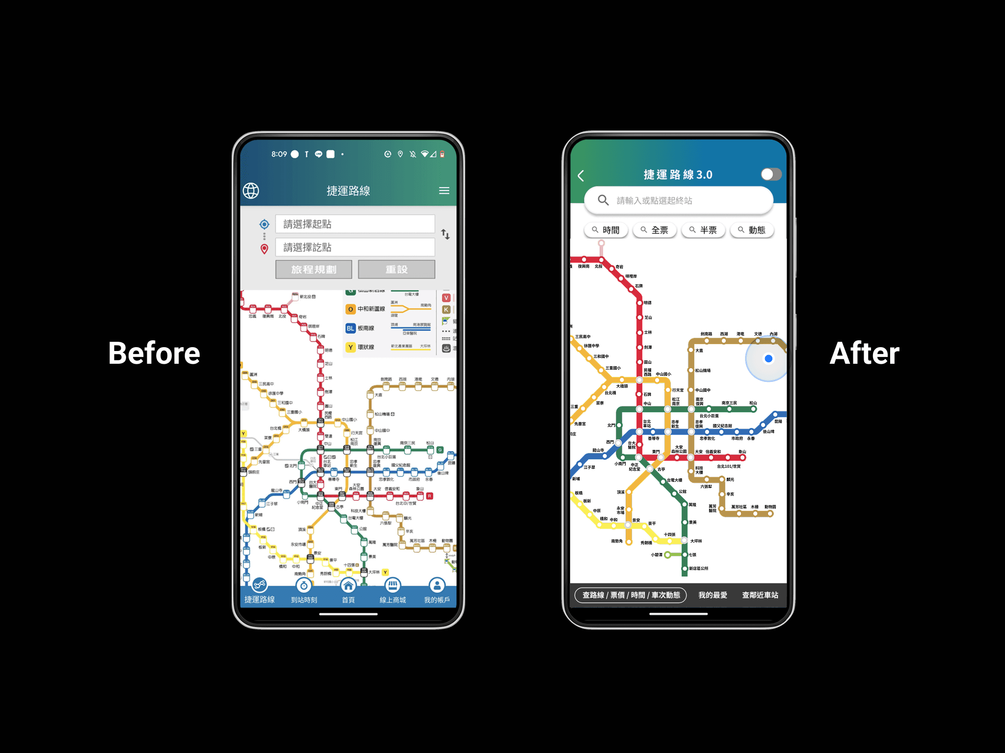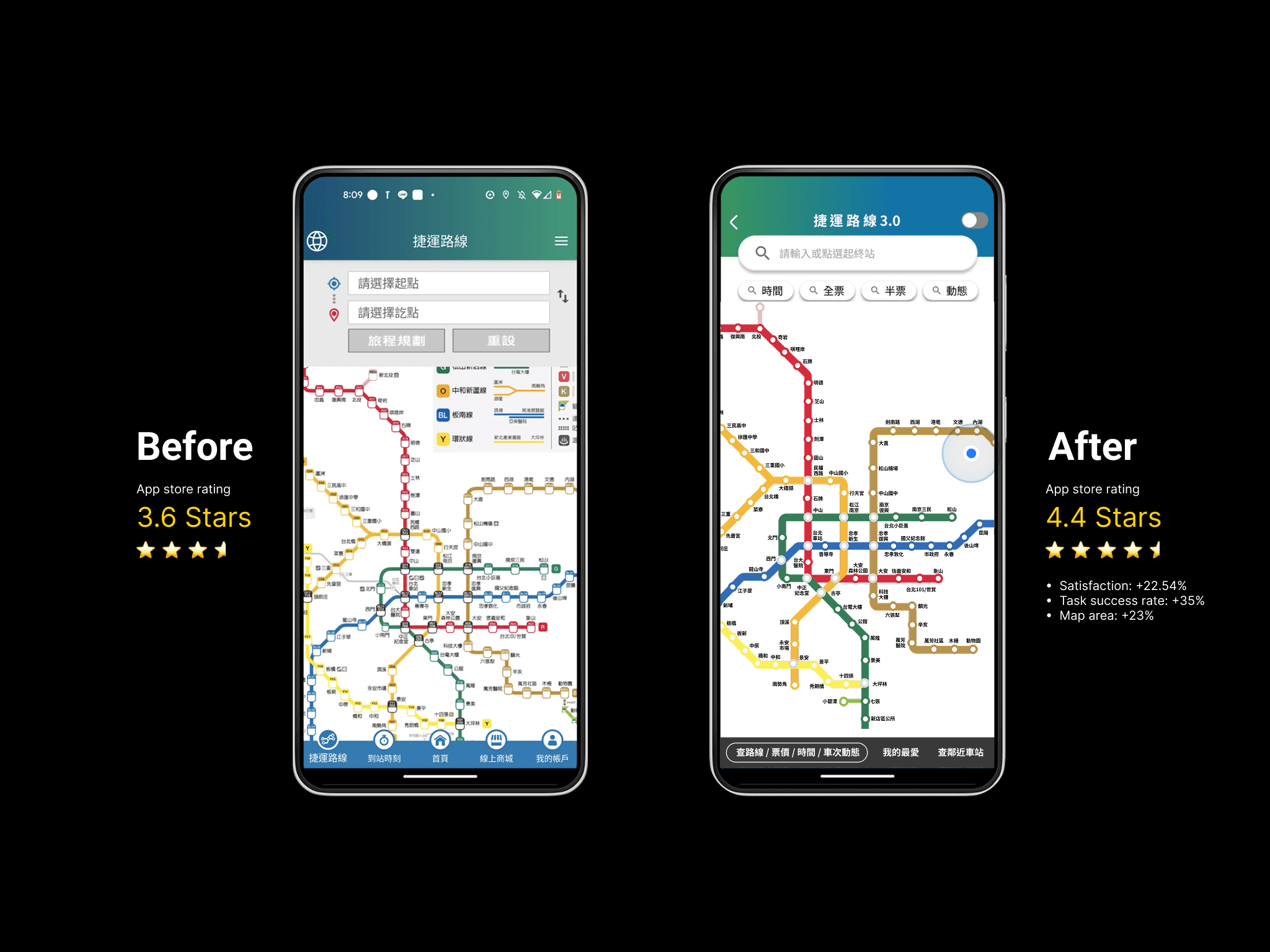 Metro Taipei GO was designed to deliver a user-centered metro experience by streamlining access to Taipei Metro services. With over 2.6 million downloads, I restructured the information architecture and unified map functions into a single entry point, reducing navigation friction and driving a 22.2% increase in user satisfaction on the Google Play Store.