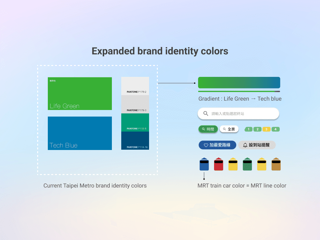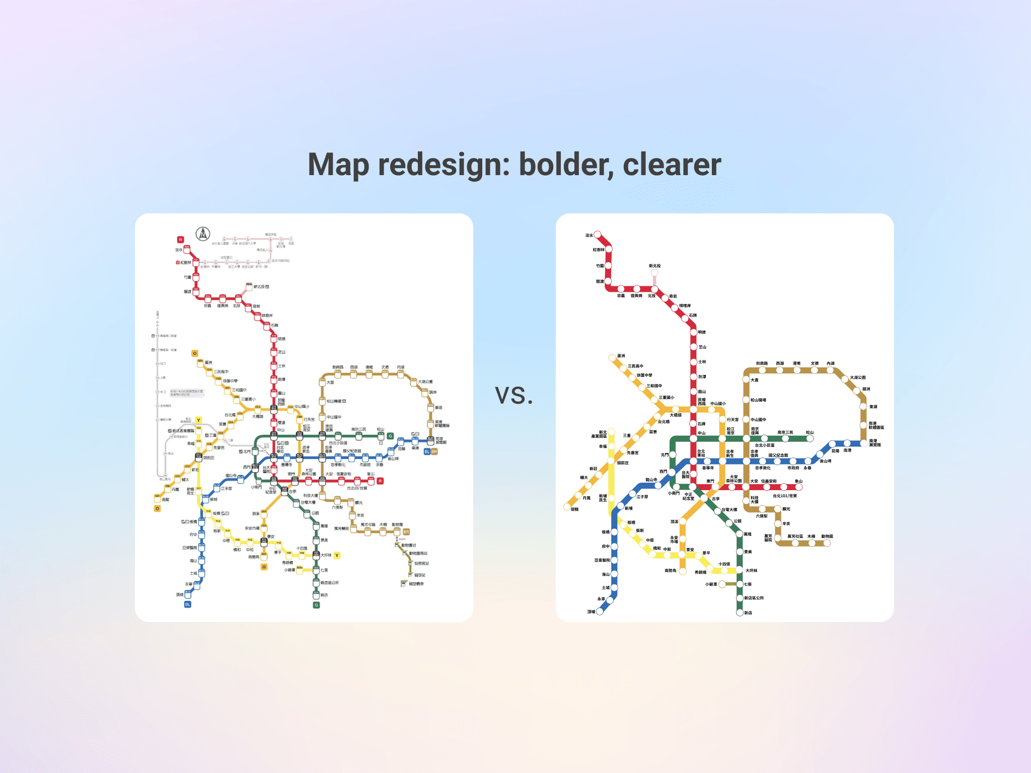 Metro Map UI Redesign: Visual Clarity Enhancement The original map’s thin lines, small station markers, and dense layout make routes hard to follow, especially on mobile, and can cause eye strain at transfer points. The redesign improves clarity with thicker, more distinct lines and larger station markers, making routes easier to track and stations easier to see and tap on mobile devices. Besides Rather than invent a new palette, I built on Taipei Metro’s existing corporate identity (CIS): • Green: Core actions (like main routes) • Blue: Supportive functions • Gray: Foundational info Every choice passed WCAG AA-level contrast checks using Figma’s Contrast plugin—so users can read clearly, even while standing in a swaying train.