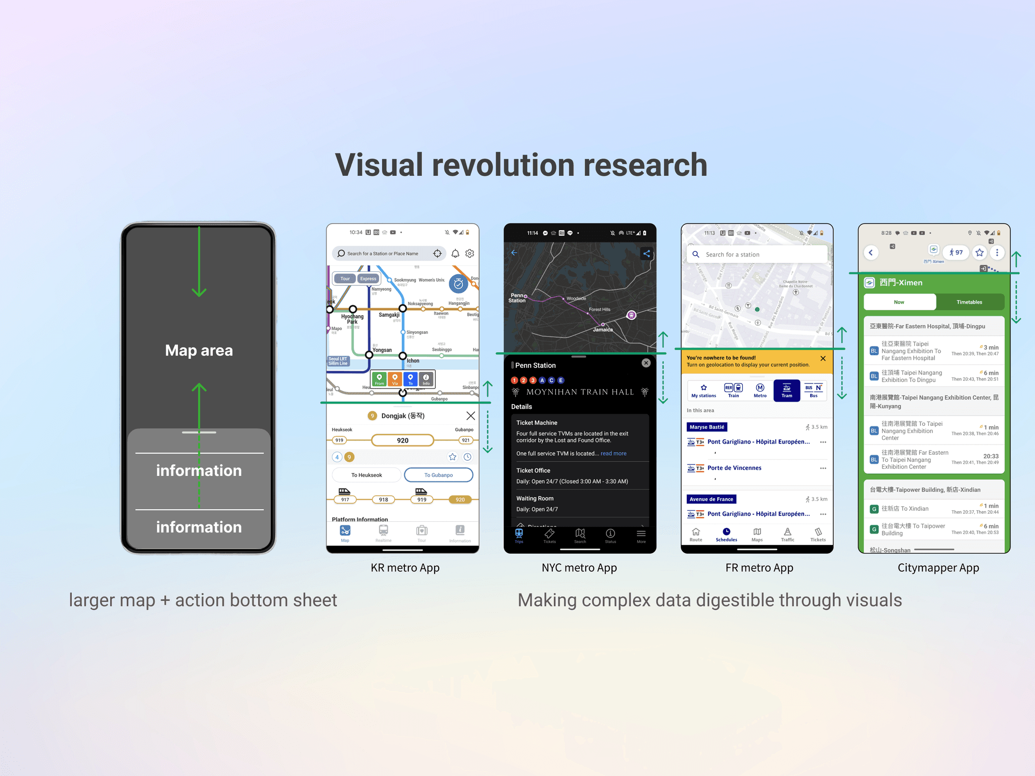 I analyzed top transit apps from Korea, Singapore, the UK, and France. They shared one key element: The Action Bottom Sheet. This expandable bottom panel keeps maps visible while letting you interact with train data in real time. It solved one of mobile’s biggest issues: screen space. No more toggling between “view” and “info”—you get both, always. A 23% Visual Revolution Most visible upgrade? The map. I decided to increase its on-screen area by 23%, a massive improvement on mobile screens. By sharpening route colors, introduced circular stations, and added clear button feedback. Now when you tap a stop, you know it’s interactive.