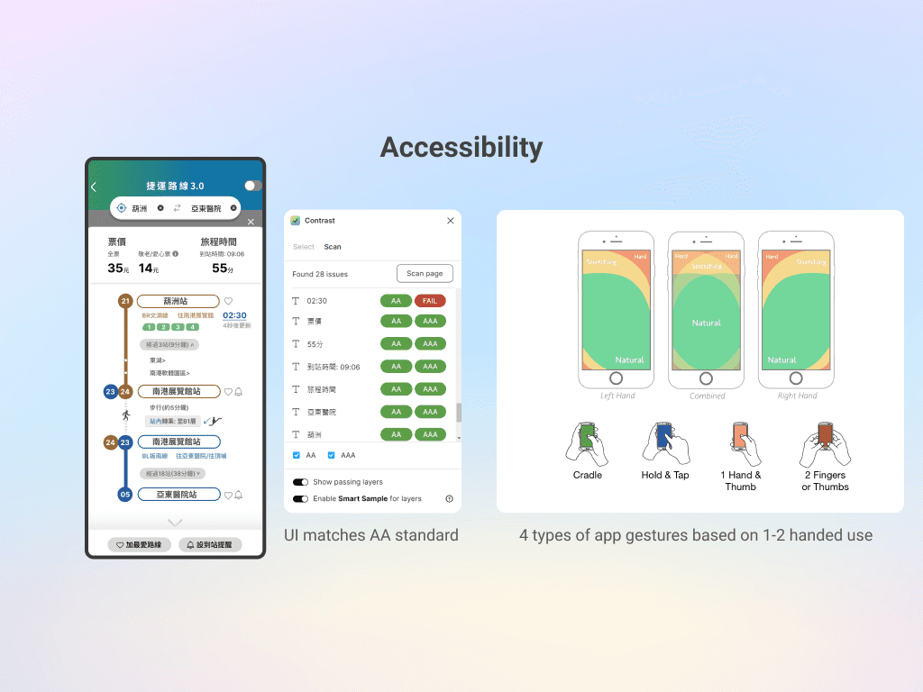 06 Accessibility: A Gentle Revolution Designing for Everyone, Not Just “Users with Disabilities” We followed A11y (Accessibility) principles—not to check boxes, but because we believe good design is universal. No color-only indicators—icons and text back up every signal Contrast-compliant visuals One-handed use on shaky trains Inspired by Steven Hoober’s mobile ergonomics research, we positioned primary actions within thumb-friendly zones. This wasn’t theoretical—it was field-tested.