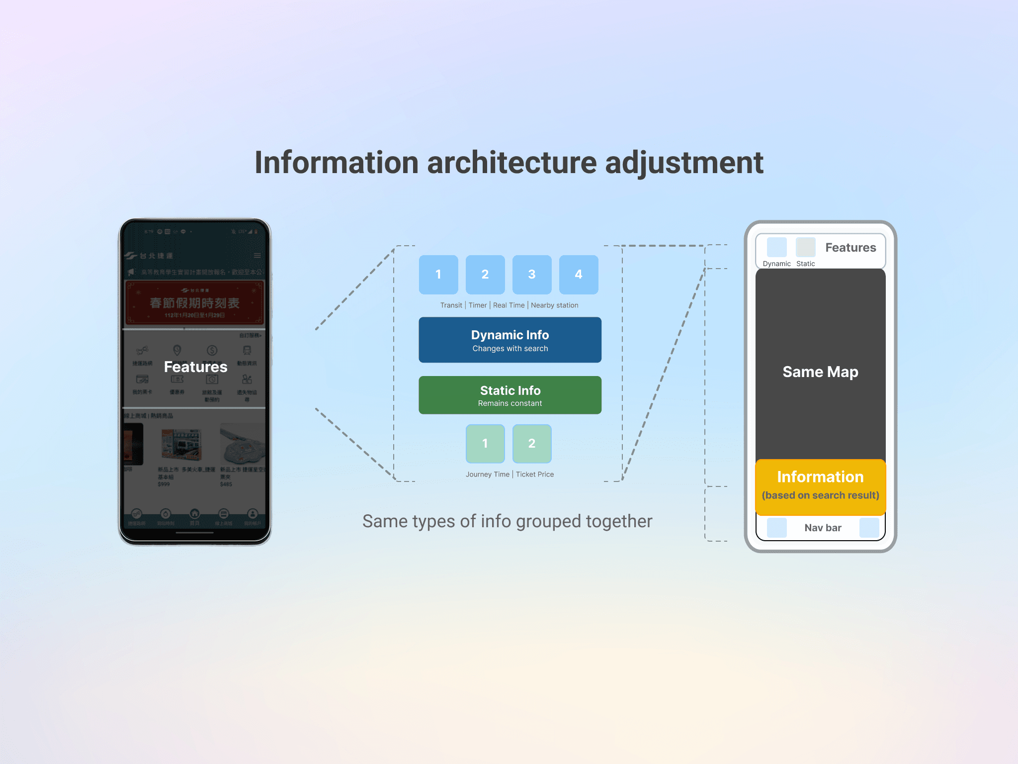 Information Architecture Adjustment The information architecture was restructured to reduce cognitive load while preserving a consistent core interface. The main UI remains stable, with only context-specific sections updating based on route search results. Six core functions were consolidated into three functional groups, allowing static and dynamic information to be accessed within a single, integrated route-planning experience. To support efficient decision-making, users can toggle between static and real-time data without leaving the screen, and contextual features such as exit reminders are directly embedded into route results. The mobile interface is organized into three clear layers—main map area, feature area, and action sheet—ensuring clarity, scalability, and ease of use during time-sensitive commuting scenarios.